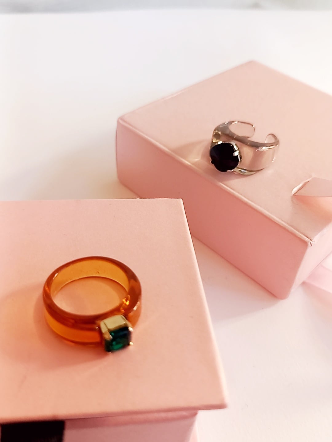 -color ring- 存在感あるcolorRingが登場! 軽やかでありながら、どんなスタイルにもマッチするデザイン。 光の加減によってエメラルドグリーンが表情を変え、あなたの指元を華やかに彩ります。 シンプルでありながらユニークな雰囲気を持つこのリングは、普段使いはもちろん、特別なシーンにもぴったりです♪ ◽color/クリアブラウン×グリーン ◽material/トップ:クリスタル(エメラルド) 石座:丹銅(ゴールド) リング:樹脂(クリアブラウン) ◽size/13号
