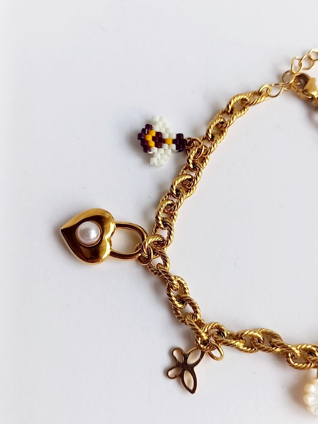 -Lave&Peace B- 心を躍らせるチャームたちが揃った「Lave&Peace B」は、あなたの手首を華やかに彩るブレスレットです。ハートキー、ハート、蝶、デイジー、ミツバチのチャームが組み合わさり、着けているだけでハッピーな気分にさせてくれます! ◽color/ゴールド ◽material/チェーン:サージカルステンレス チャーム(ハートキー・ハート・蝶):サージカルステンレス チャーム(ミツバチ):ガラスビーズ チャーム(デイジー):シェル 留め金:サージカルステンレス ◽size/約16.18.20.25cm(+4㎝アジャスター) ▽チェーンの長さがお選びできます。備考欄にてお知らせください。