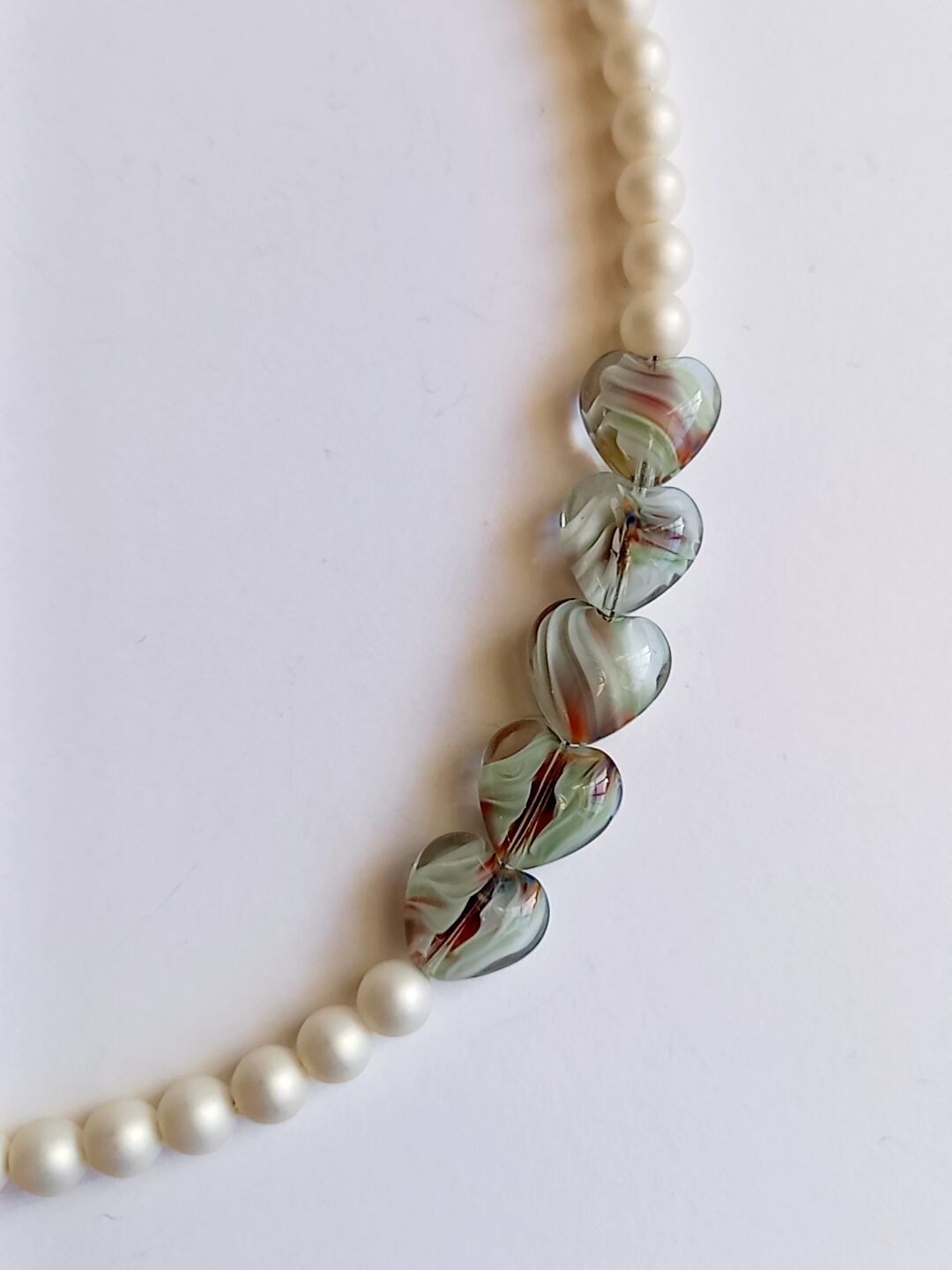 マット加工が施された高級感あふれるパールがシンプルながらも洗練された印象を与えます。愛らしいマーブル柄のハートガラスビーズがアクセントに。