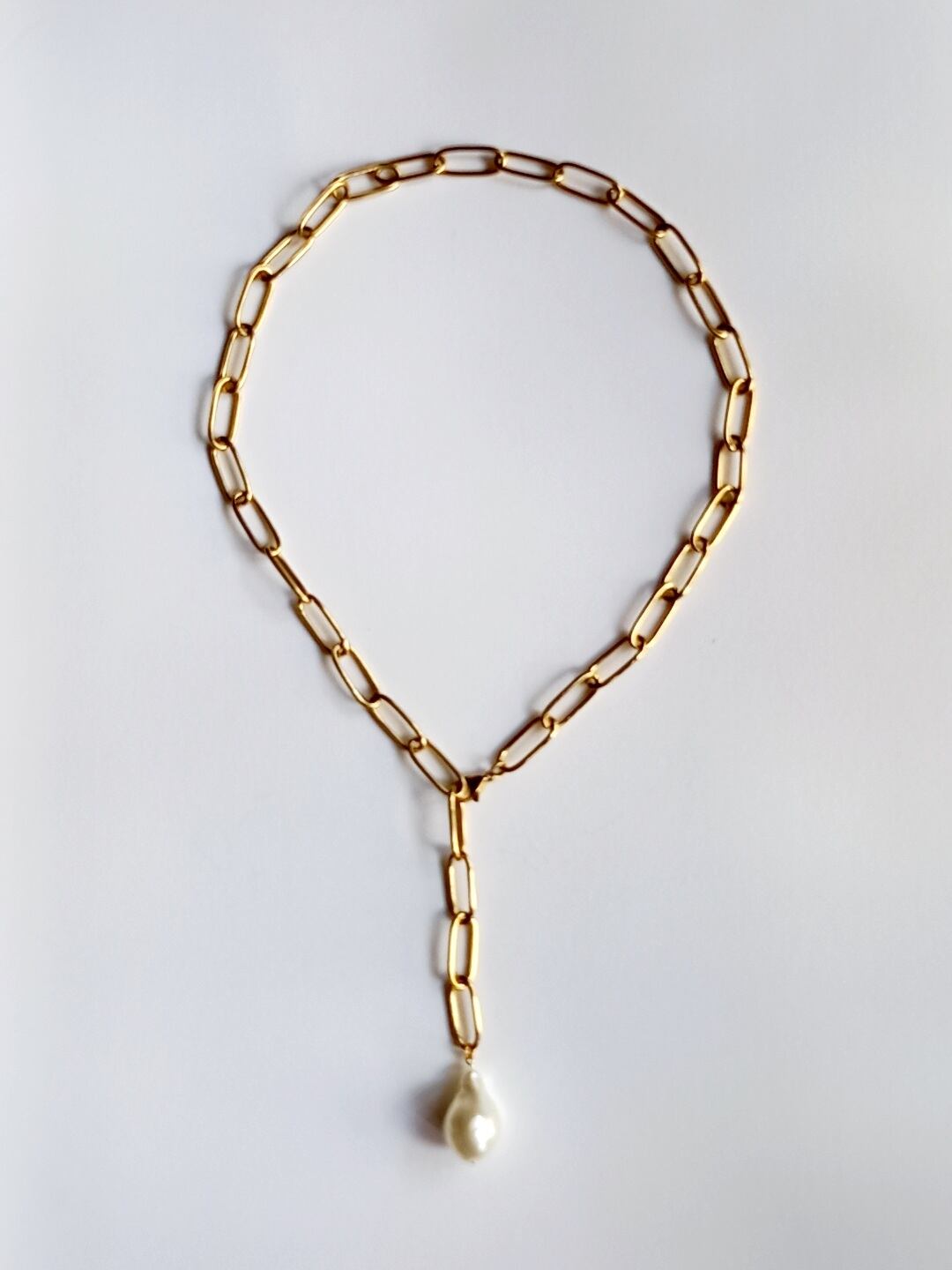 存在感のある太めのチェーンがシンプルな服装にも華やかさをプラスしてくれます。