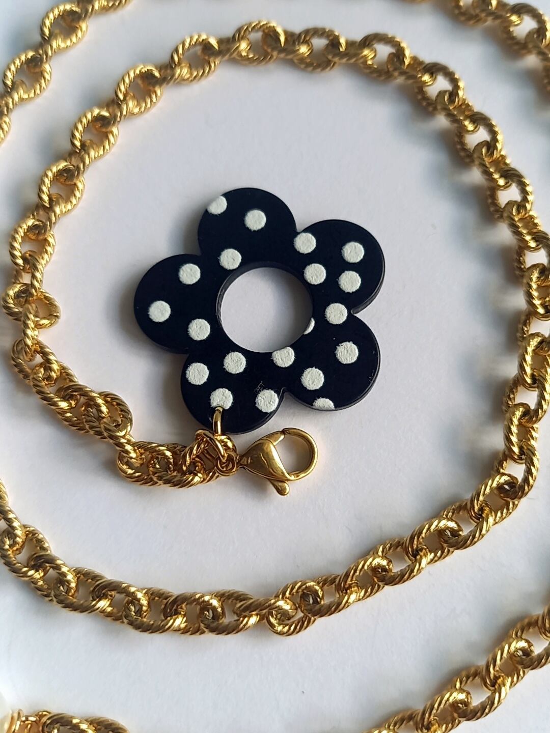 ドット柄フラワーで可愛さ満載のアレンジ可能なアクセサリーです。長さを調整したり、フラワーチャームの位置を変えたりできるラリエットタイプのネックレスなので、自分だけのスタイルを楽しむことができます