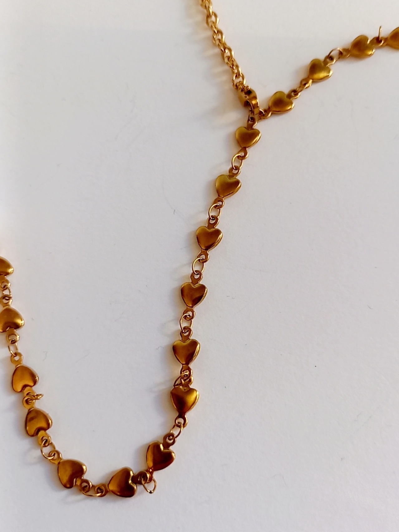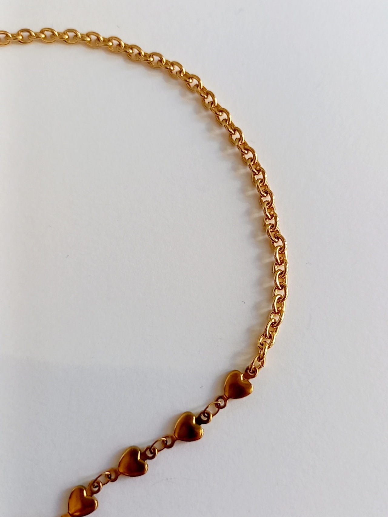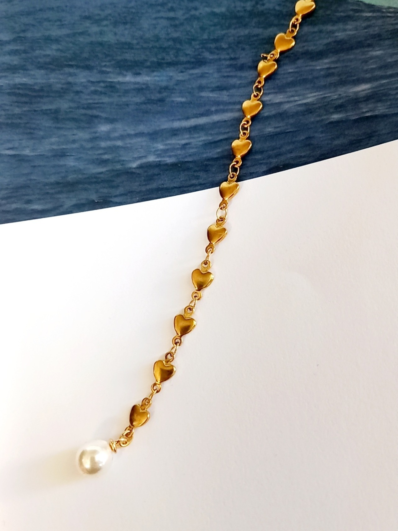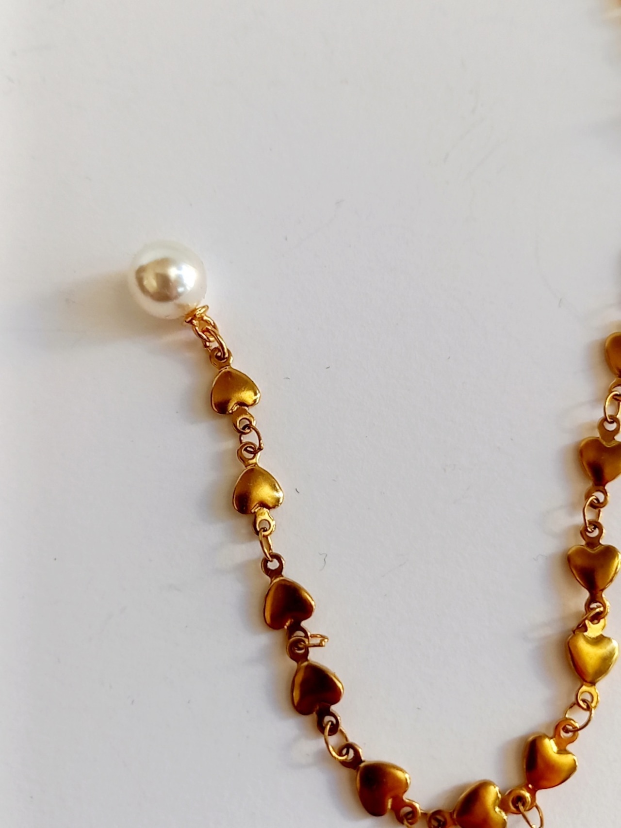 ハートモチーフが並んだデザインとシンプルなチェーンの組み合わせが、多彩な着こなしを演出。パールのチャームがさりげなくアクセントに♪